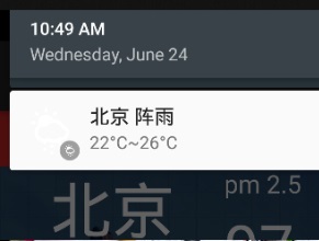 4.在通知栏中常驻了天气信息的通知,这样用户在不打开天气预报程序的时候就可以看到天气信息,而且选择通知栏常驻,不会因为程序的关闭和切换导致通知的消失,更加方便。