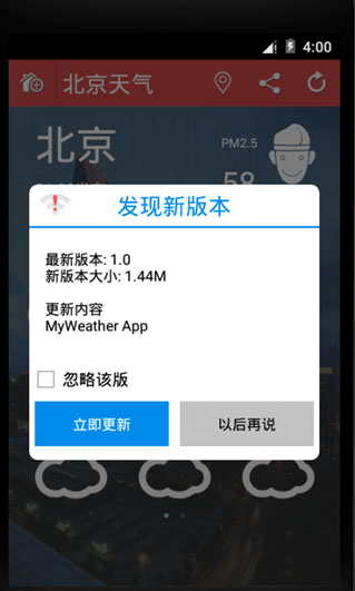 版本更新实现:1.导入SDK所需jar包 下载最新版SDK的zip包,将其中的libs文件夹合并到本地工程libs子目录下。 2.添加资源文件 将SDK提供的res文件夹拷入工程目录下, 和工程本身res目录合并。请不要随便删除其中的文件。 注:友盟SDK提供的资源文件都以umeng_开头。 3.配置AndroidManifest.xml