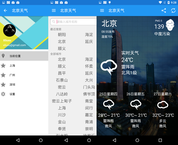 加入了城市搜索功能,可以查看我们想看的城市的天气情况,还有近期的搜索城市的缓存
